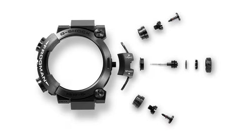 Originally produced in resin, the complex design has now been remade in titanium, with each component crafted separately and polished meticulously for an entirely new feel of high-end quality. The watch is built with an intricate combination of over 70 exterior components, including an O-ring waterproof seal to deliver outstanding FROGMAN water resistance and special buffers to strengthen the shock-resistant structure — all while maintaining the beauty of form the MR-G line is known for.