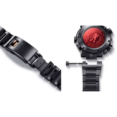The watch features a specially developed titanium band that offers a comfortable fit on the wrist thanks to its many moveable parts. Every link is painstakingly treated with a deep-layer hardening process and DLC coating prior to assembly, giving the band a premium-quality, intricate finish. The band is also extendable so it can even be worn over a wetsuit. Simply remove the side pins while pressing the buttons on the lugs’ underside to quickly and easily swap out the band.