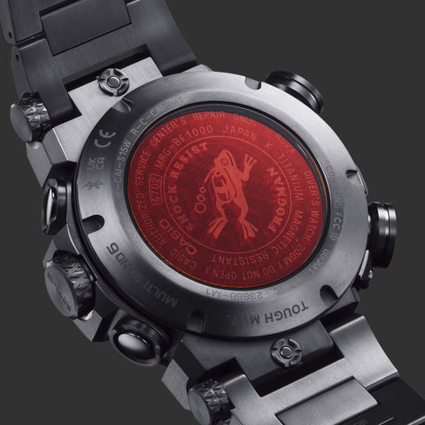 The dedicated MR-G module features a gold-plated retainer plate. The screw-lock case back is fit with sapphire crystal finished in red vapor deposition and engraved with the iconic FROGMAN diving frog character.