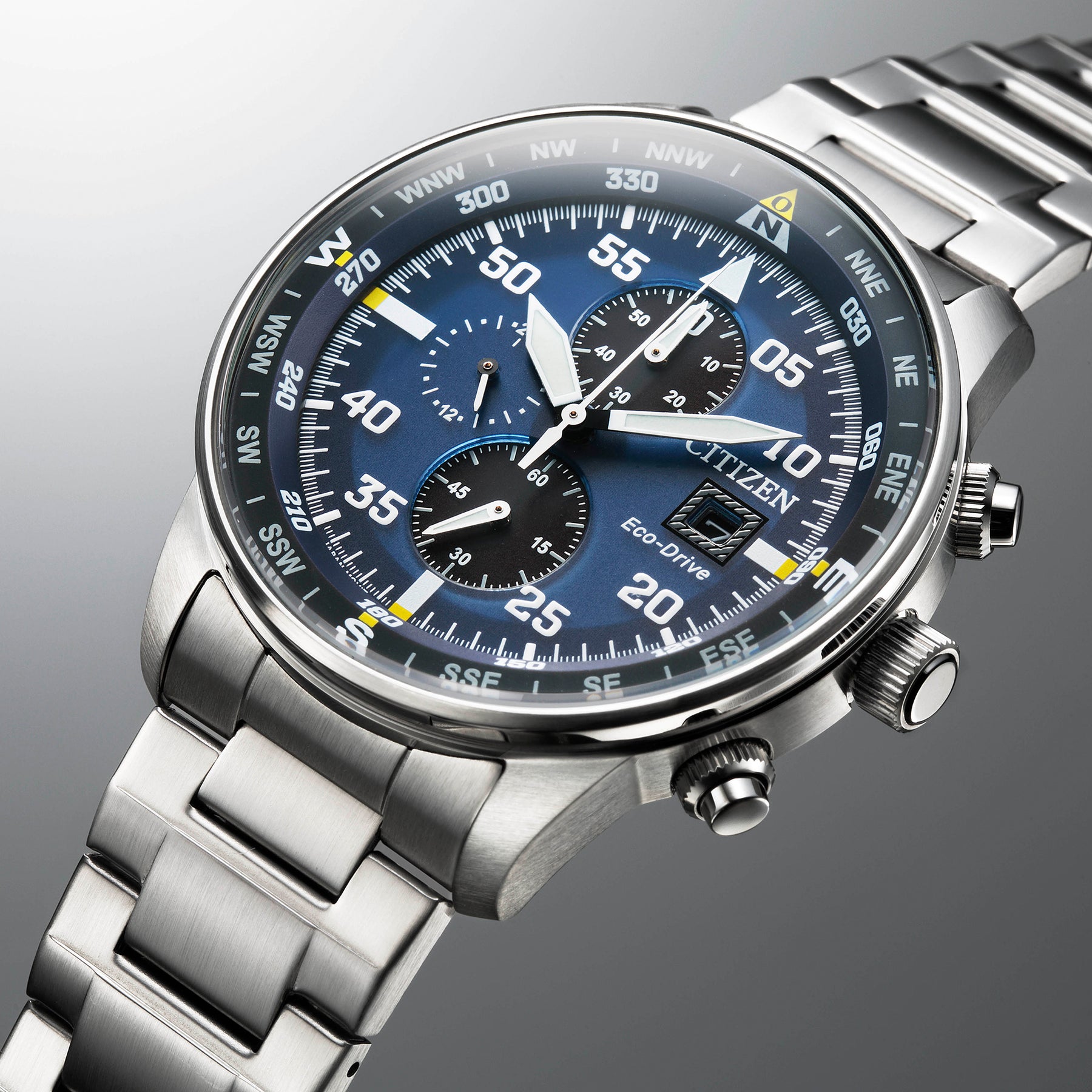 Bringing together precision technology and reliable durability, this watch from the Chronograph Collection represents the ceaseless quest for improvement. Better starts now, with tachymeter and chronograph precise to 1/5 of a second up to 60 minutes for consistent accuracy. Featuring sleek blue dial with a stainless steel bracelet, date display and 12/24 hour time, as well as 100 metres water resistance, it is stylishly functional. Powered by Eco-Drive- the revolutionary light powered movement from Citizen, this watch has the ability to continuously recharge in any light source and can run for a minimum of six months even in the dark without any charge. This revolutionary earth friendly technology eliminates the need to change battery frequently and gives you hassle free timekeeping, never disappointing you when you need it the most. The Eco-Drive movement also comes with built-in Insufficient Charge Warning Function and Overcharge Prevention Function.
