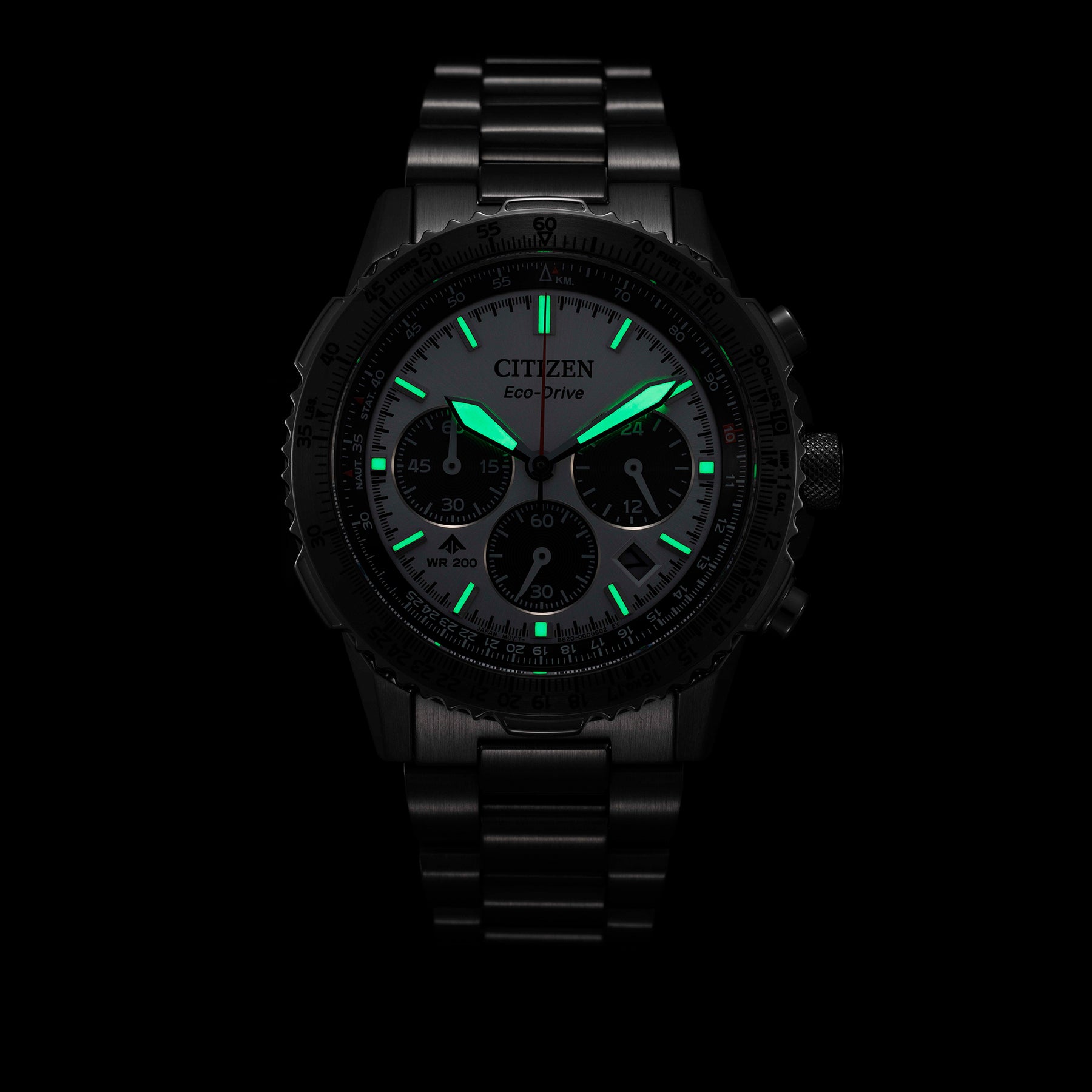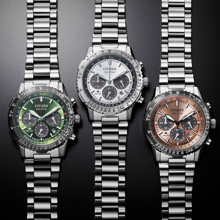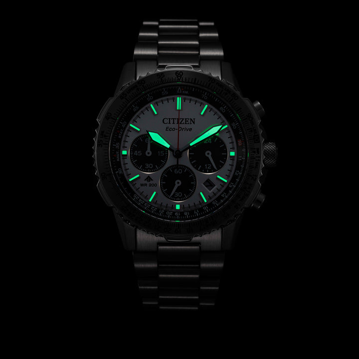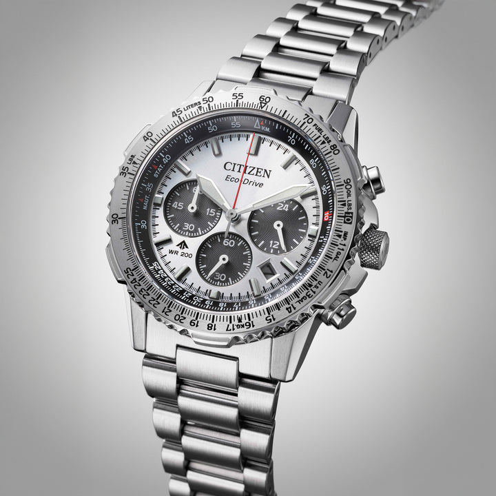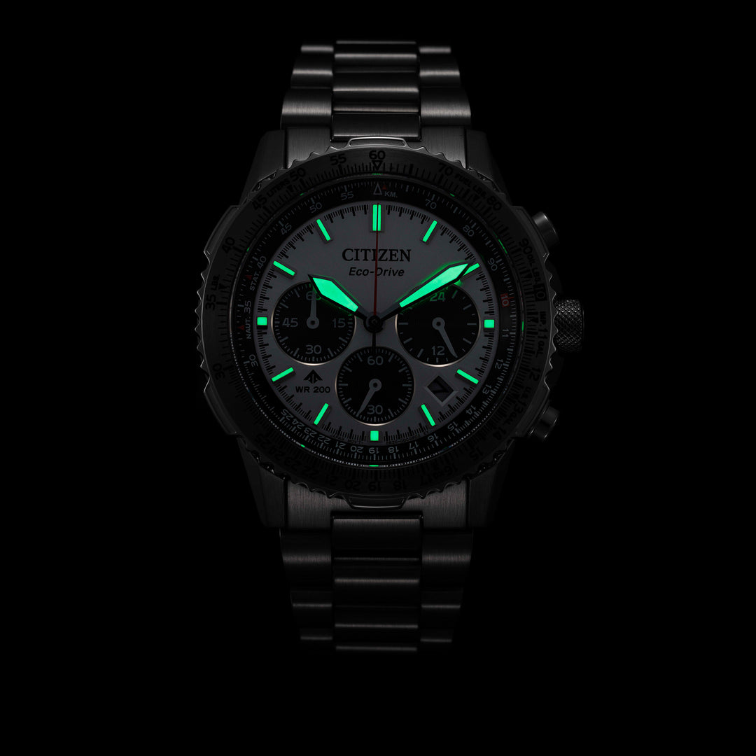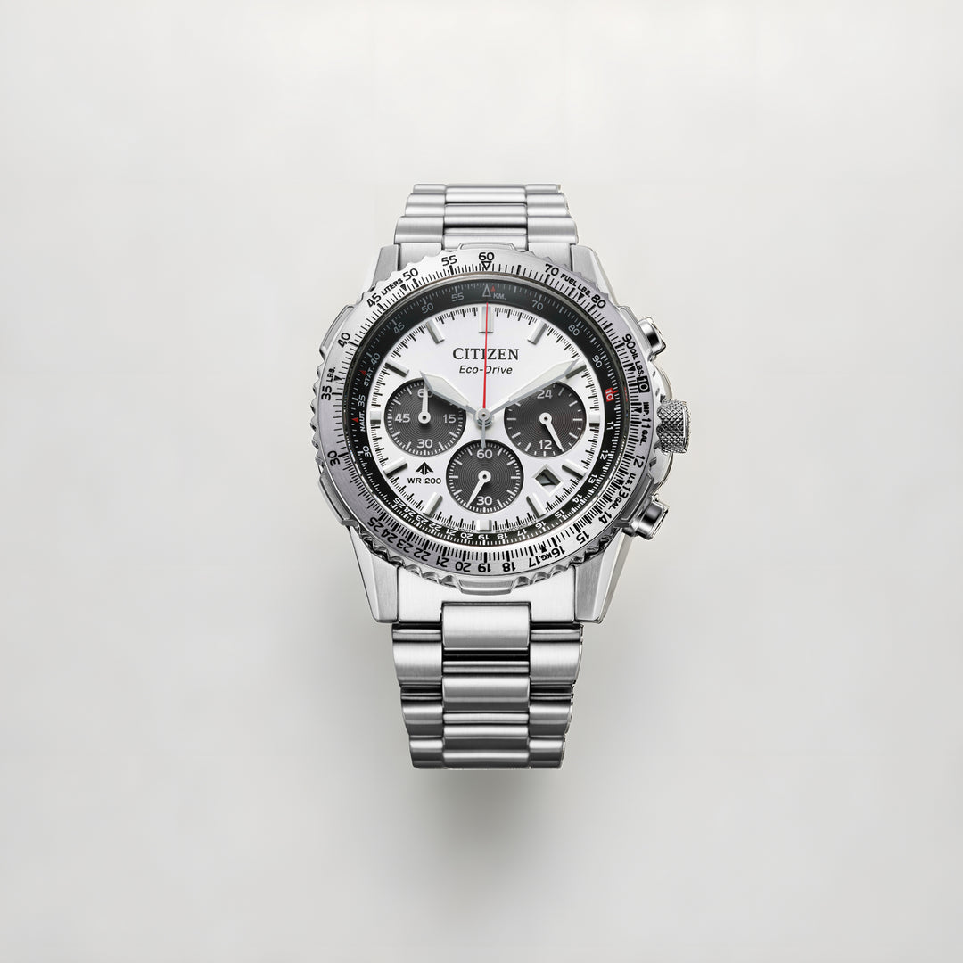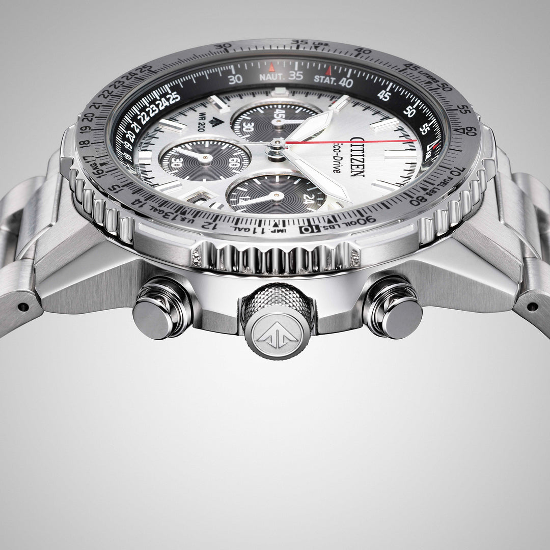 With advanced technology paired with an incredibly bold look, the latest Promaster Air Navihawk reaches a higher altitude in style. The watch's silver-tone stainless steel case measures 40mm in diameter, wearing boldly with its sharp faceting and satin finishing, while a slide-rule scale on the bezel provides additional flight utility. A triple-link stainless steel bracelet secures the timepiece to the wrist. On the dial, a silver-tone colorway with red, black, and white accents adds to the watch's superior legibility, while a sapphire crystal and 200m of water resistance protect it all. Functions include a 1/5 second chronograph measuring up to 60 minutes, 12/24 hour time displays, and a date indicator, all powered by our Eco-Drive technology– sustainably powered by light and never needing a battery. Caliber B620.