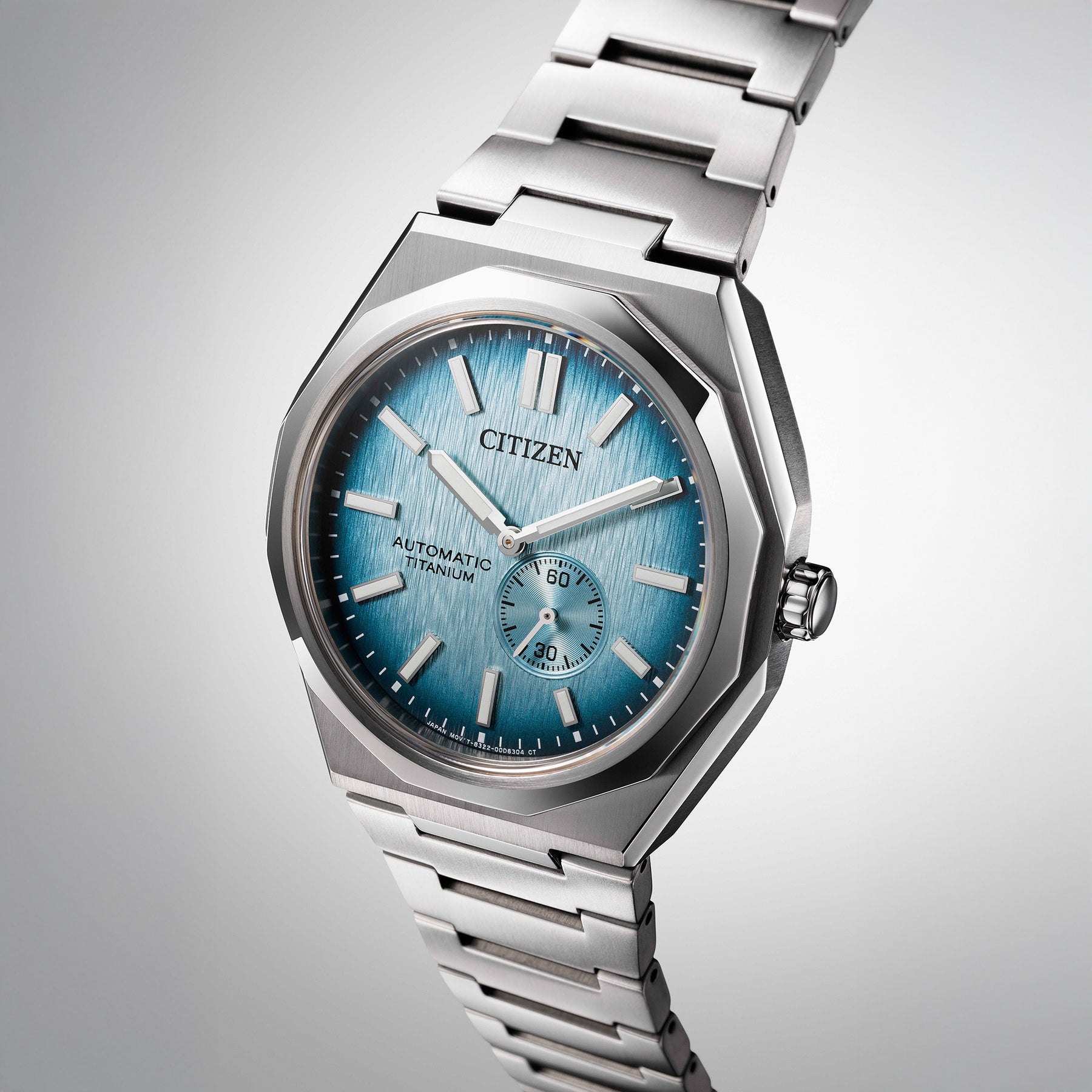 The Citizen Zenshin 60 NK5020-58L is a refined automatic timepiece crafted entirely from lightweight and durable Super Titanium™, enhanced with scratch-resistant Duratect coating. It features a 40.5mm case and is powered by Citizen’s in-house Caliber 8322 movement, offering a 60-hour power reserve, stop-seconds function, and daily accuracy of –20 to +40 seconds. The watch showcases a striking dégradé light blue dial with a small seconds subdial positioned between 4 and 5 o’clock, protected by sapphire crystal and complemented by an exhibition caseback. With 100-meter water resistance and a Super Titanium™ bracelet, the NK5020-58L blends mechanical precision, modern elegance, and everyday comfort.