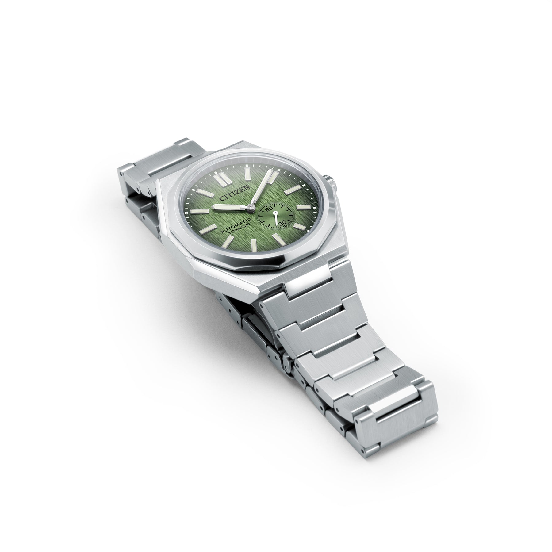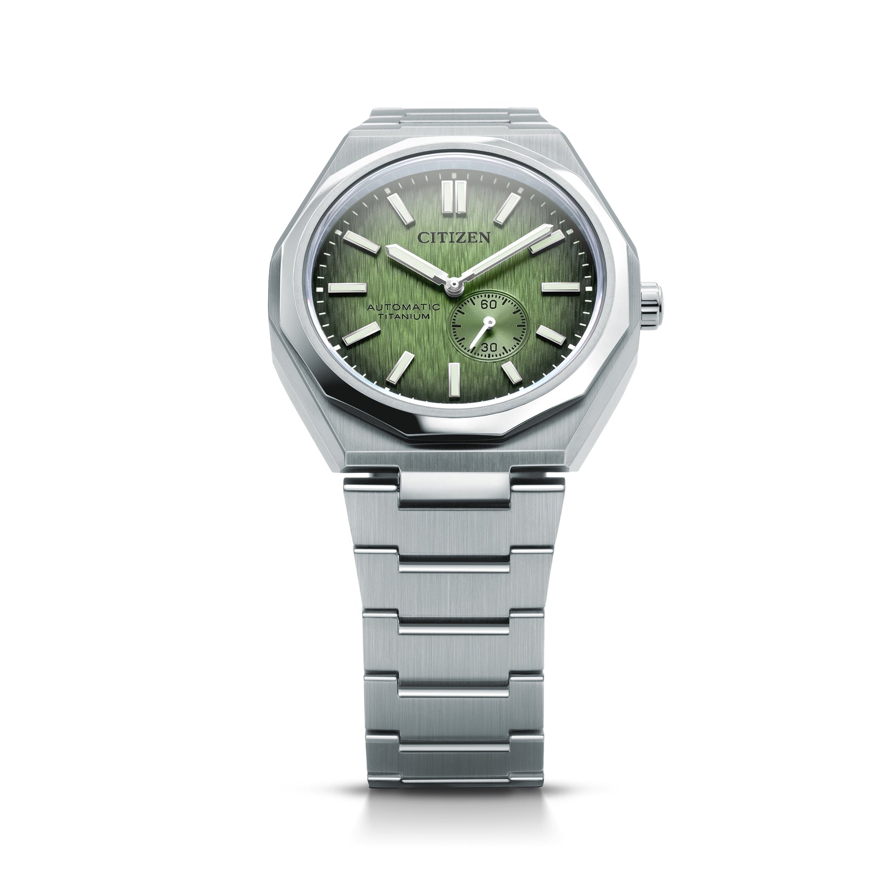 The Citizen Zenshin 60 NK5020-58X is a sophisticated automatic watch that exemplifies innovation and elegance. Housed in a 40.5mm Super Titanium™ case and bracelet with a scratch-resistant Duratect coating, it offers exceptional durability and a lightweight wearing experience. Powered by the in-house Caliber 8322 movement, it provides a 60-hour power reserve, hacking seconds, and a daily accuracy of –20 to +40 seconds. The standout feature is its gradient green dégradé dial, which brings a contemporary depth to the design, accented by a small seconds subdial at 4:30 and safeguarded by sapphire crystal. The exhibition caseback reveals the intricate mechanics, while a distinctive 12-sided bezel and 100-meter water resistance complete the refined yet resilient profile of this timepiece.