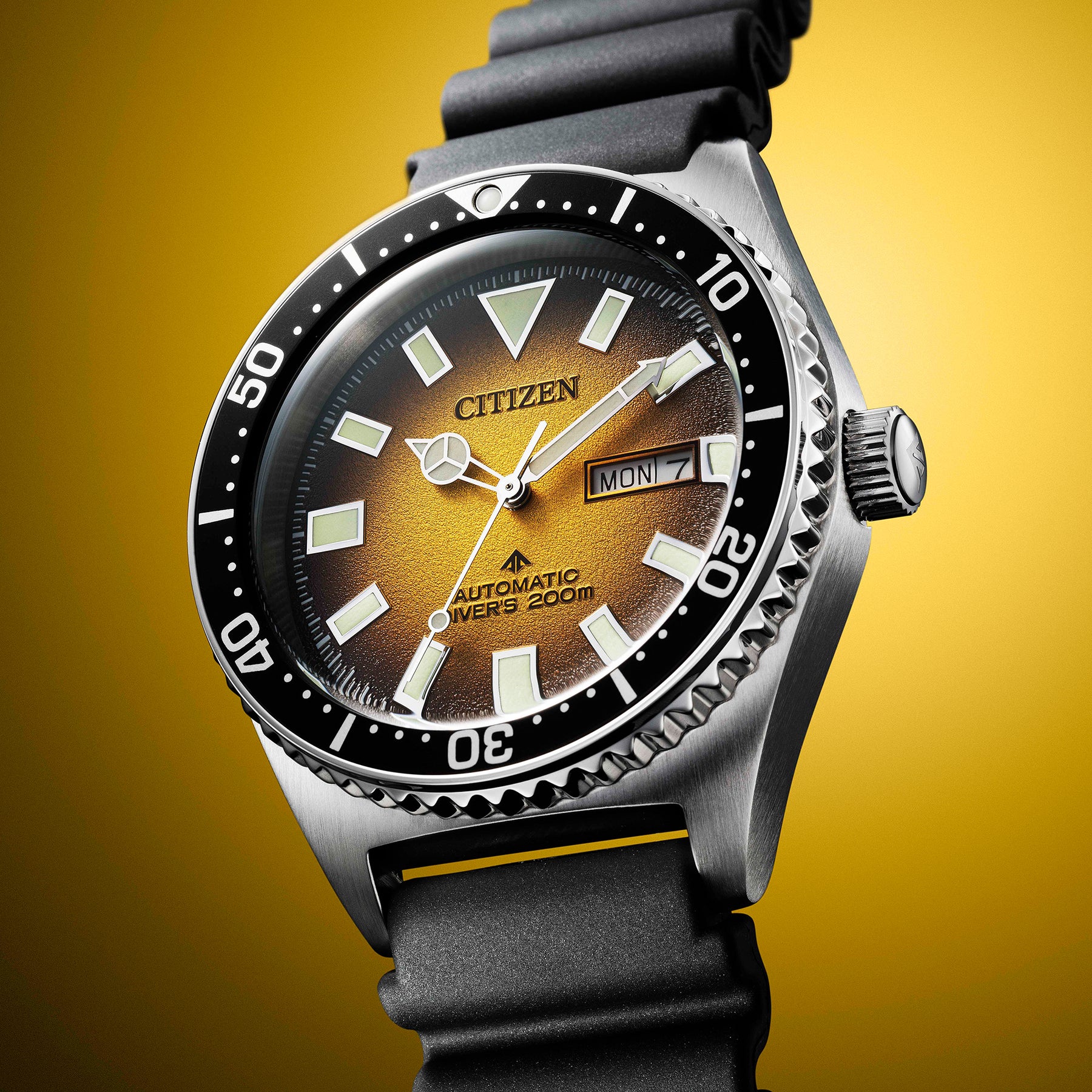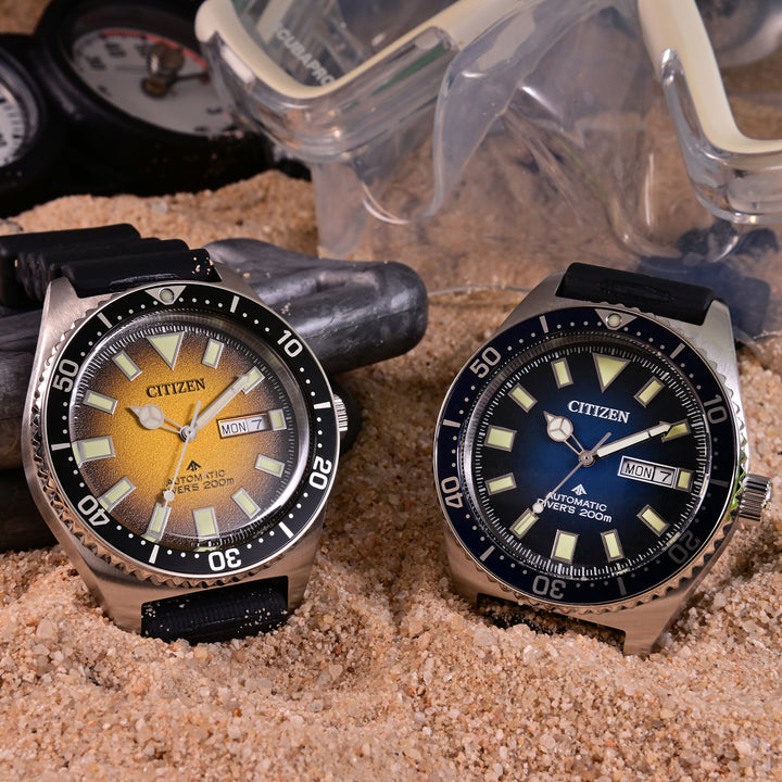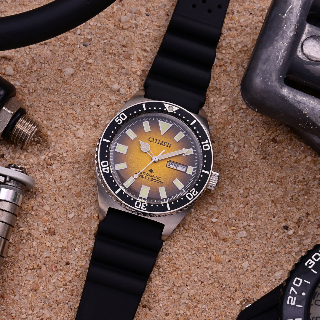 Dive into reliability and precision with the new Citizen Promaster Marine Automatic, a robust timepiece designed for the adventurous man. Built with a 41mm stainless steel case, it offers durability along with a sporty elegance that stands out both under the sea and on land. This watch features an automatic movement, eliminating the need for a battery and offering an impressive 42-hour power reserve. Perfect for divers and water sports enthusiasts, it provides a water resistance of up to 200 meters, ensuring performance in deep waters. The dial is both functional and stylish, set with luminescent hands and markers for clear visibility in low light conditions. The day and date display keeps you on track, while the unidirectional rotating bezel allows for easy monitoring of dive times or other measurements. The watch is fitted with a comfortable and resilient black polyurethane strap with a standard buckle, ensuring a secure fit for any adventure. A mineral dual sphere glass covers the dial, providing high resistance to scratches and impacts. Sporting a vibrant, gradient yellow dial, this Divers Automatic is not just a tool watch but also a statement piece that speaks to the wearer's rugged sophistication. This Citizen Promaster Marine Automatic comes with a 3-year regional warranty plus an additional 1-year international warranty. Whether navigating the depths of the ocean or the urban jungle, this timepiece is your reliable partner for every journey.