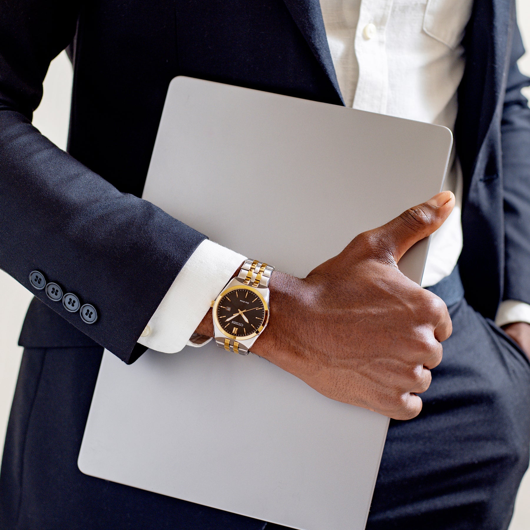 A classic timepiece is always in style in the Corso men’s watch from CITIZEN. Featuring a two-tone gold and silver-tone stainless steel bracelet and case with a 3-hand black dial and date indicator, luminous hands and gold-tone markers, this elegant timepiece also features a fold-over clasp closure with hidden push buttons and is water resistant to 100 meters. If you’re looking for a dress watch to add classic style to your wardrobe, look no further – the Corso is the perfect choice. It also uses Citizen’s Eco-Drive technology, so it is sustainably powered by any light and will never need a battery. Caliber number E111.