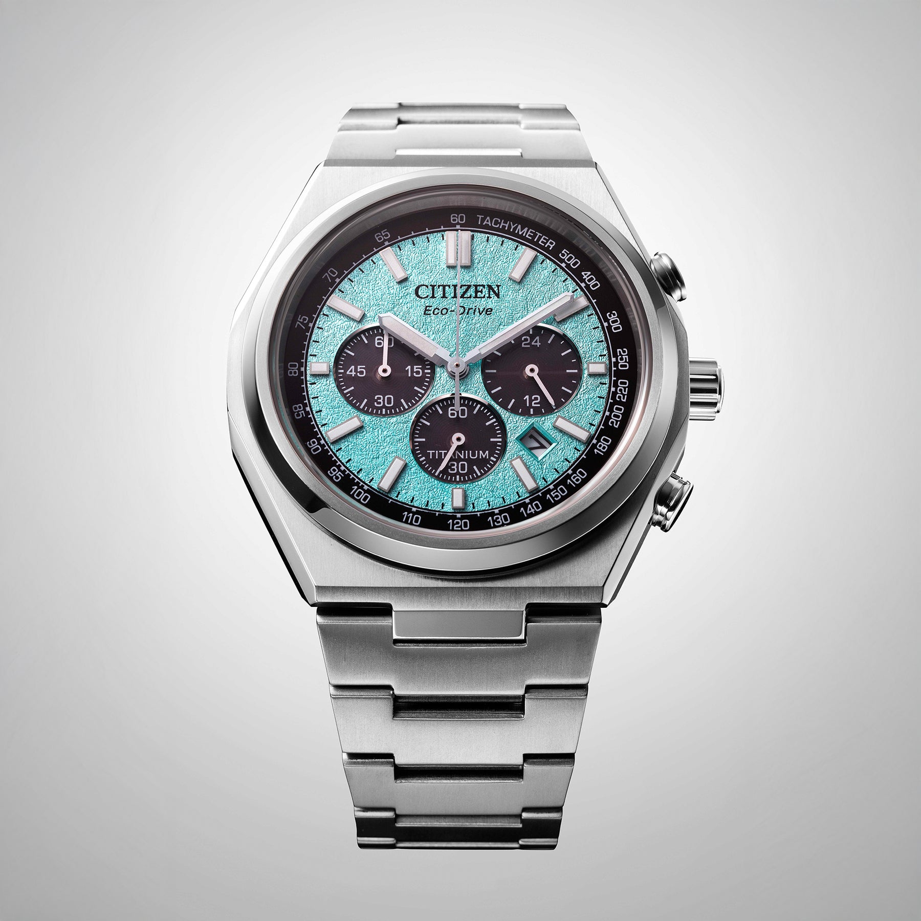 Pairing classic proportions with a distinctly modern style, meet the new Zenshin series from Citizen. Featuring a 42.4mm silver-tone Super Titanium™ case paired with stylish stepped chronograph pushers and a stylized crown, the finely brushed and polished timepiece is secured to the wrist with a matching integrated bracelet. On the dial, a textured light blue color is accented with an outer tachymetric scale and triple register configuration in black, with details in silver-tone and white put to use for the handset and applied indices. Features include running time, a split-second chronograph, 12/24 hour time, and date. Sustainably powered by any light with Eco-Drive technology and never needs a battery. Water resistant to 100 meters. Caliber B620.
