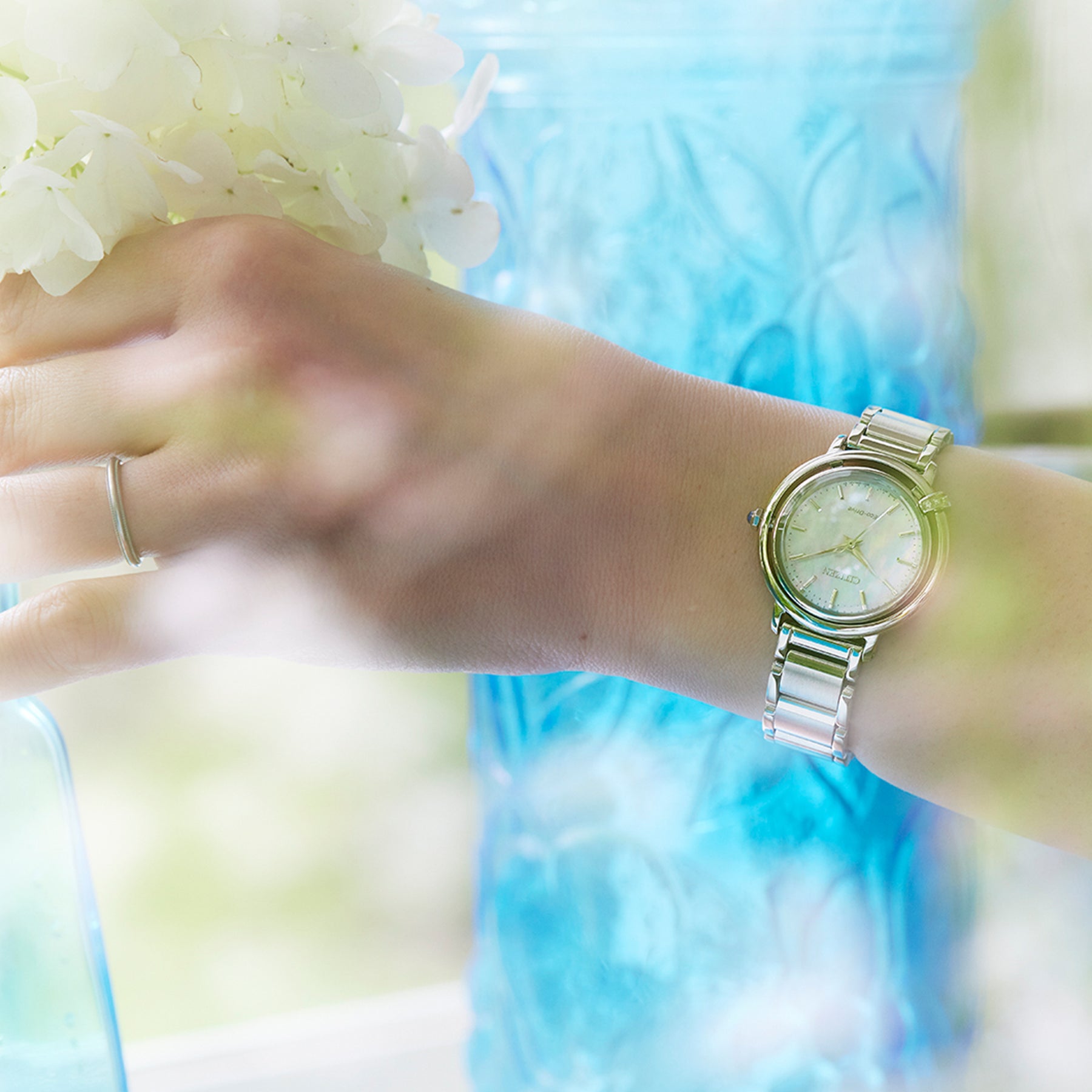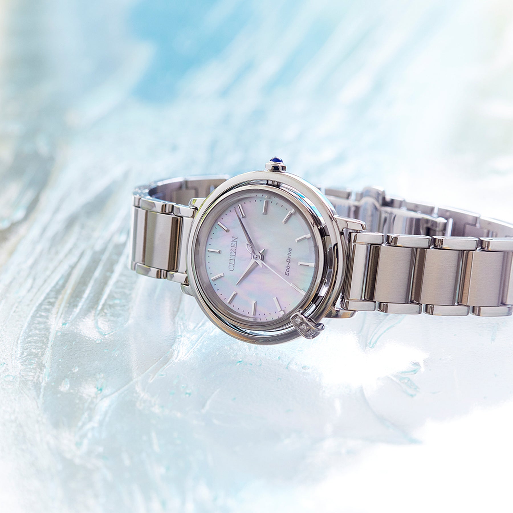 Classic lines and hints of romance make this newest piece to our ladies' collection; the CITIZEN L Arcly is a glamorous addition. Inspired by the sunrise, this watch features a sleek design that combines the gentle, curving lines of the stainless-steel case with lustrous mother-of-pearl dial to showcase the delicate beauty of the sunrise itself. Continuing to provide sustainable watches, the CITIZEN L collection uses the elegant designs to reflect the beauty of the planet while evoking the feelings of joy and happiness every time you look at your wrist.Special features also include a 3 set diamond at the 7 o'clock postion, representing the the appearence of the first flash of dawn and extra strap.