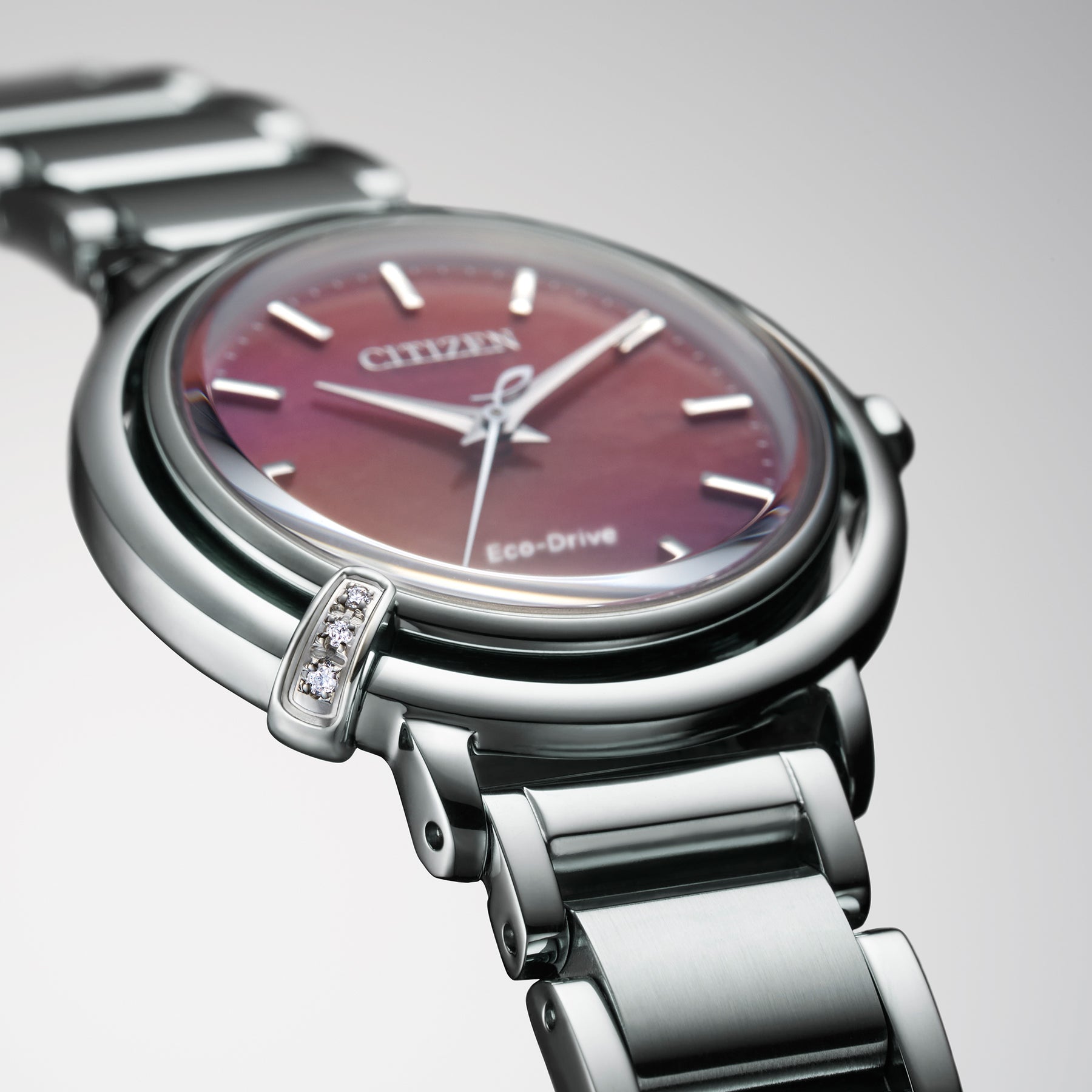 Classic lines and hints of romance make this newest piece to our ladies' collection; the CITIZEN L Arcly is a glamorous addition. Inspired by the sunrise, this watch features a sleek design that combines the gentle, curving lines of the stainless-steel case with lustrous mother-of-pearl dial to showcase the delicate beauty of the sunrise itself. Continuing to provide sustainable watches, the CITIZEN L collection uses the elegant designs to reflect the beauty of the planet while evoking the feelings of joy and happiness every time you look at your wrist.Special features also include a 3 set diamond at the 7 o'clock postion, representing the the appearence of the first flash of dawn and extra strap.