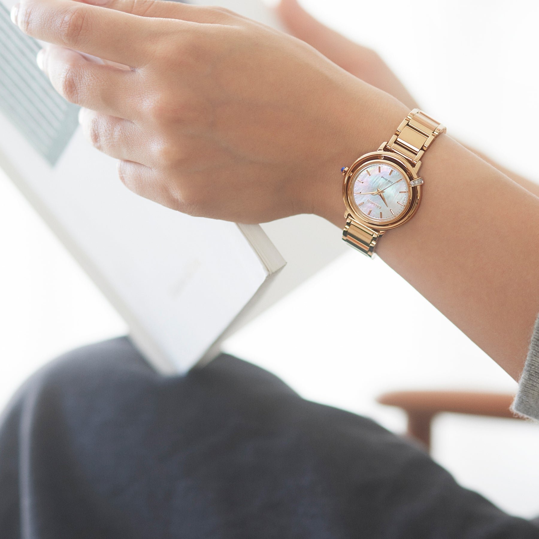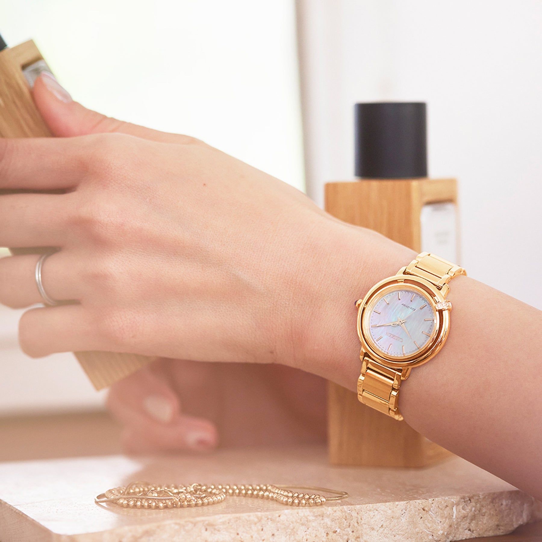 Classic lines and hints of romance make this newest piece to our ladies' collection; the CITIZEN L Arcly is a glamorous addition. Inspired by the sunrise, this watch features a sleek design that combines the gentle, curving lines of the stainless-steel case with lustrous mother-of-pearl dial to showcase the delicate beauty of the sunrise itself. Continuing to provide sustainable watches, the CITIZEN L collection uses the elegant designs to reflect the beauty of the planet while evoking the feelings of joy and happiness every time you look at your wrist.Special features also include a 3 set diamond at the 7 o'clock postion, representing the the appearence of the first flash of dawn and extra strap.