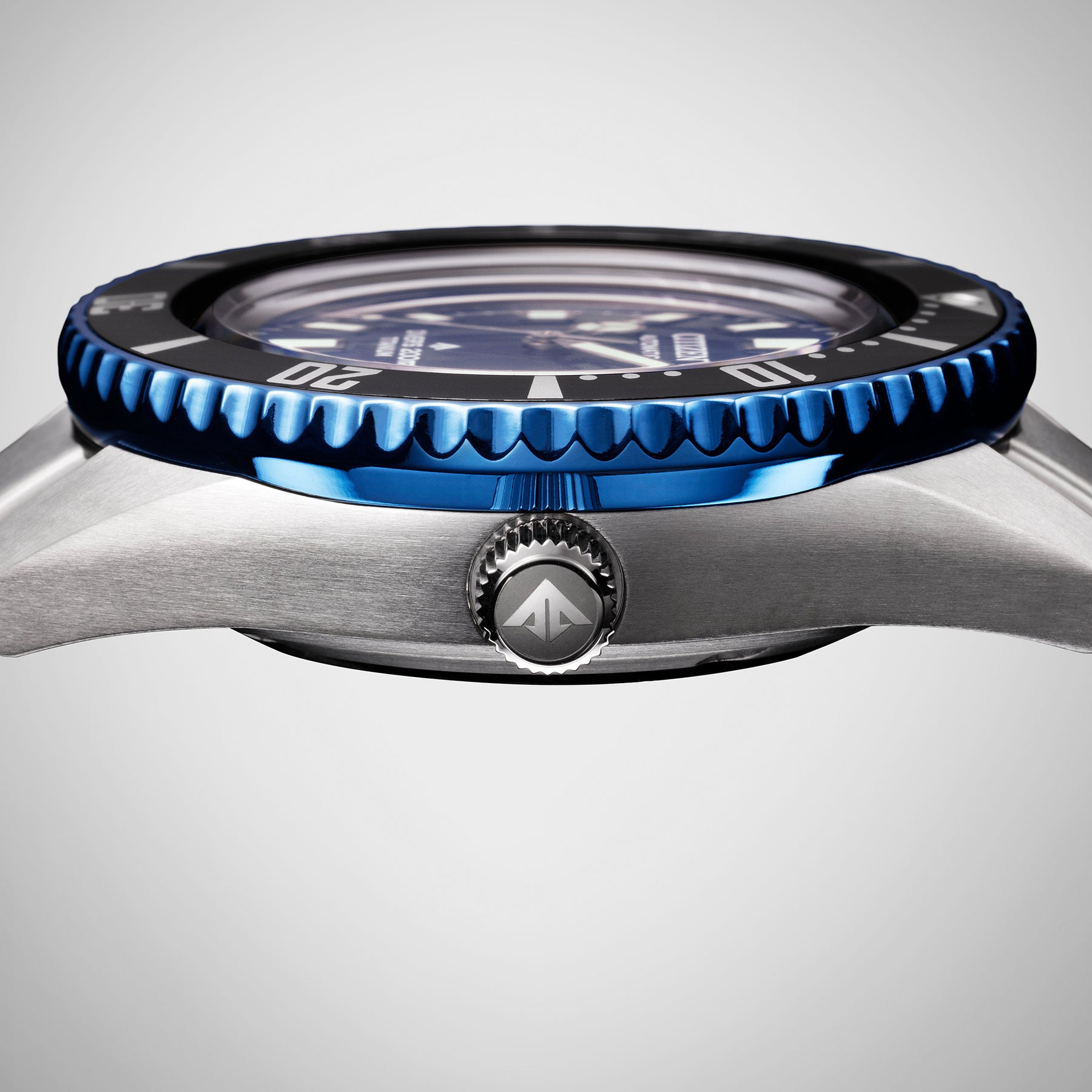 The watch's dial and uni-directional bezel feature a marine blue color, with the display making use of embossed hands and a classic green luminous for a vintage feel. The professional-grade timepiece is powered by an advanced automatic movement that boasts enhanced magnetic resistance to protect against interference from everyday devices, as well as a 42-hour power reserve. This high-performance watch comes in an exclusive blue collector’s dive tank box, is ISO compliant and water resistant to 200 meters. Caliber number 9051.