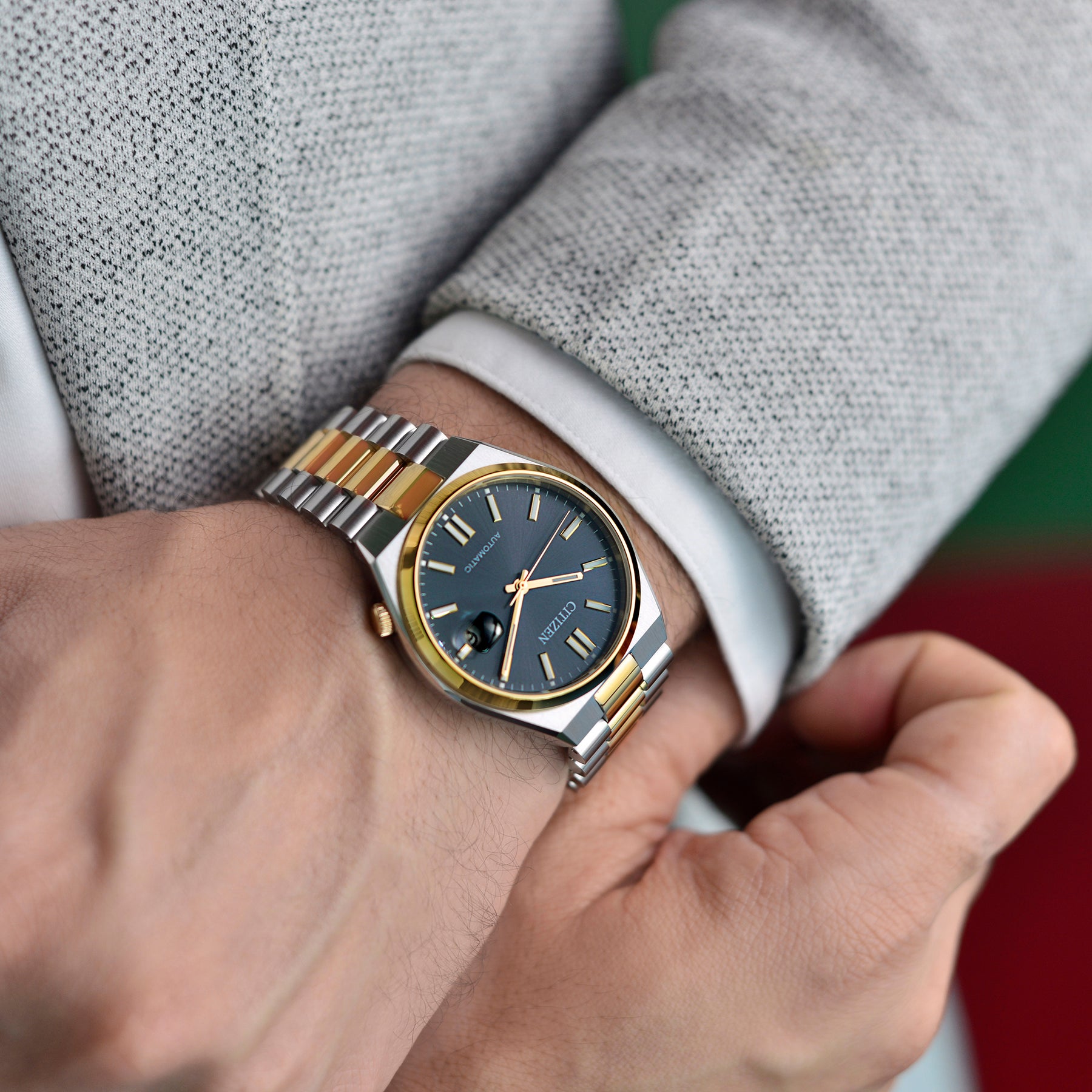 The Citizen Tsuyosa NJ0154 80H redefines modern elegance with its two tone stainless steel and rose gold case (40 mm), seamlessly integrated bracelet, and refined sapphire crystal. Powered by the dependable Caliber 8210 automatic movement with a 42 hour power reserve and visible via a skeleton case back, this mechanical timepiece delivers classic craftsmanship with contemporary flair. The anthracite grey dial showcases luminous hands and markers alongside a practical date window, offering legibility and timeless appeal . With 50 m water resistance and a fold over clasp with push button, it’s built to perform in everyday life. Classic style meets mechanical mastery—experience enduring sophistication with the Tsuyosa NJ0154 80H.