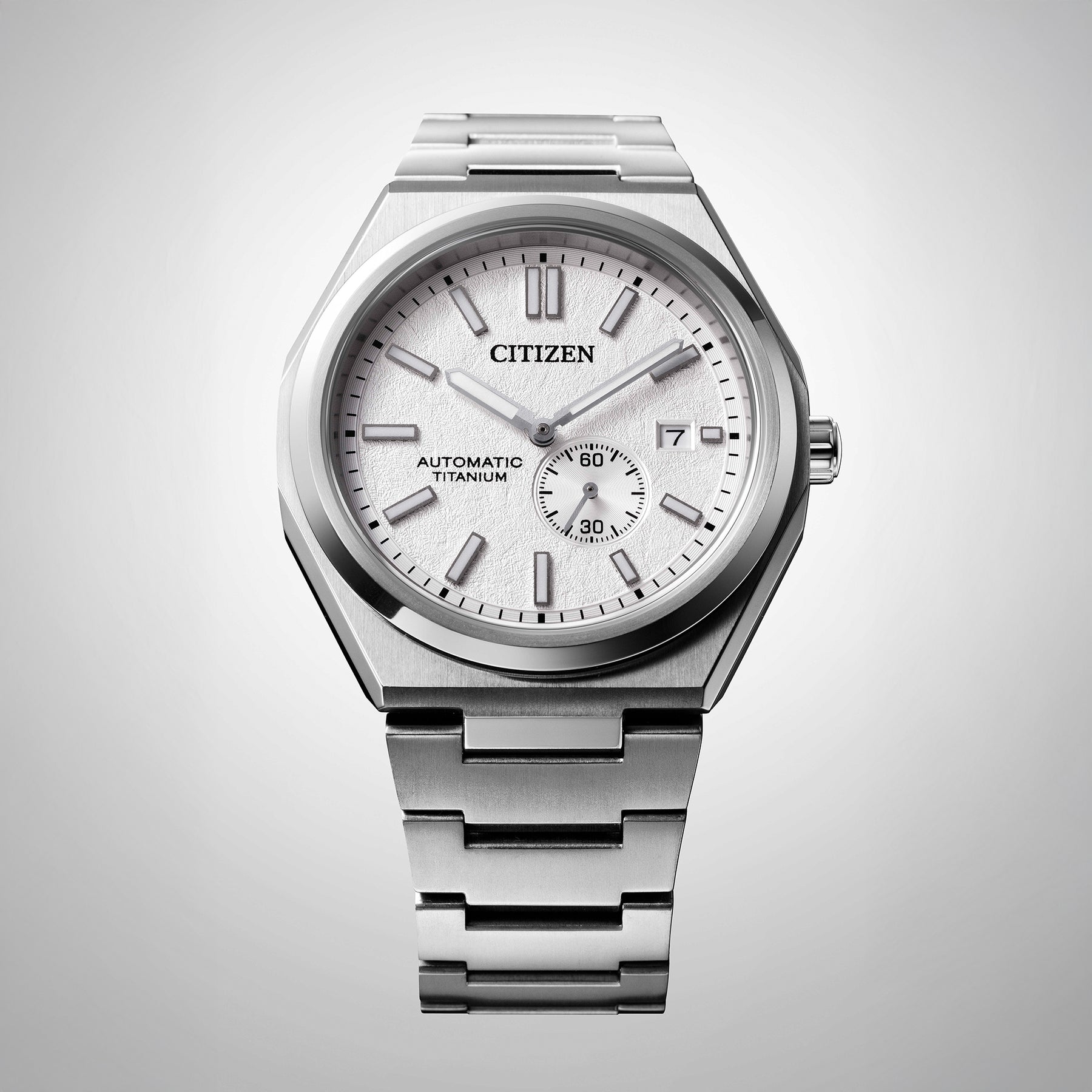 Pairing classic proportions and innovative technology with a distinctly modern style, we present our new Zenshin Automatic series. Made with our proprietary material, Super Titanium™, which is five times harder and 40% lighter than stainless steel and is scratch- and rust-resistant, this sporty timepiece features a 40.5mm silver-tone Super Titanium™ case that is elevated with finely brushed and polished finishing while being secured to the wrist with an integrated matching bracelet. On the dial, a textured white color is accented with an outer minute ring in black, with silver-tone details and luminous hands and markers. A date window at the 3 o'clock position adds daily utility, while an off-center sub-dial beside it indicates the running time powered by the mechanical movement inside. Water resistant to 100 meters. Automatic caliber 8213.