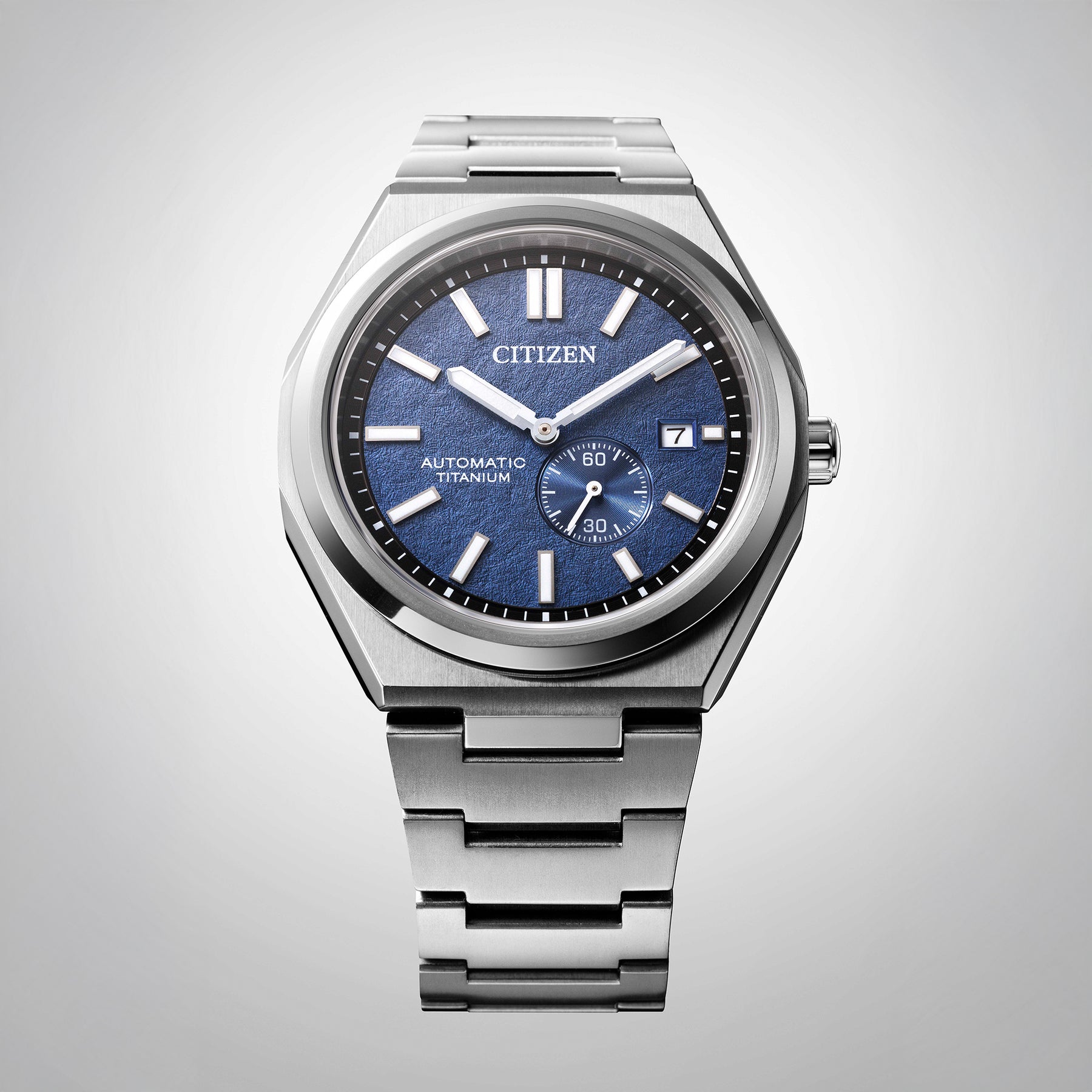 Pairing classic proportions and innovative technology with a distinctly modern style, we present our new Zenshin Automatic series. Made with our proprietary material, Super Titanium™, which is five times harder and 40% lighter than stainless steel and is scratch- and rust-resistant, this sporty timepiece features a 40.5mm silver-tone Super Titanium™ case that is elevated with finely brushed and polished finishing while being secured to the wrist with an integrated matching bracelet. On the dial, a textured blue color is accented with an outer minute ring in black, with silver-tone details and luminous hands and markers. A date window at the 3 o'clock position adds daily utility, while an off-center sub-dial beside it indicates the running time powered by the mechanical movement inside. Water resistant to 100 meters. Automatic caliber 8213.